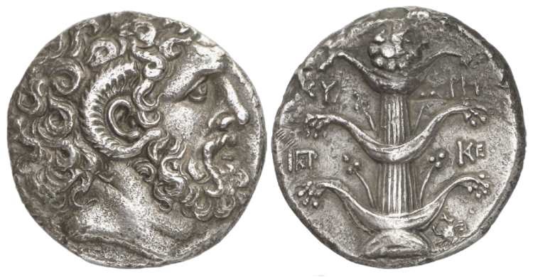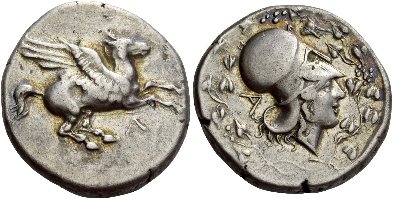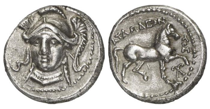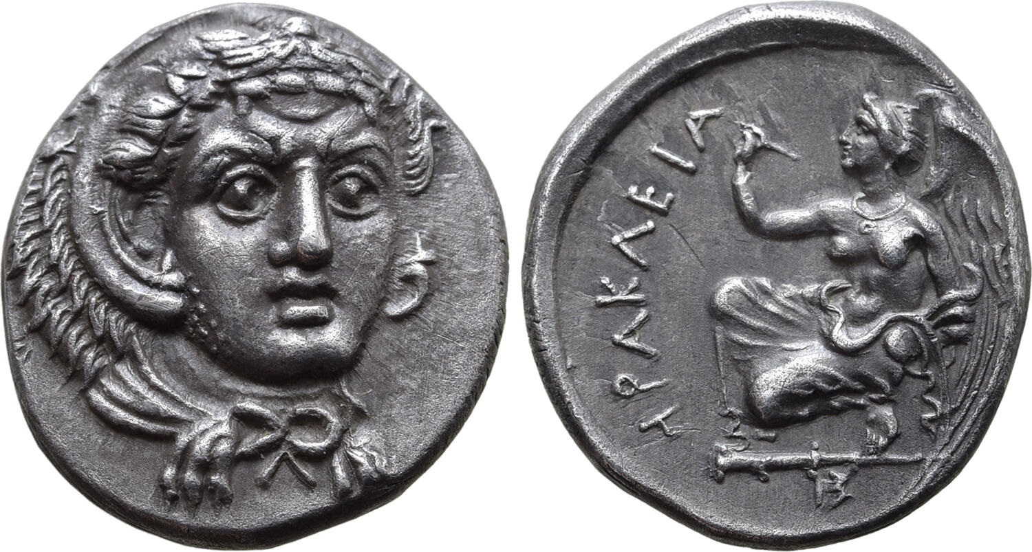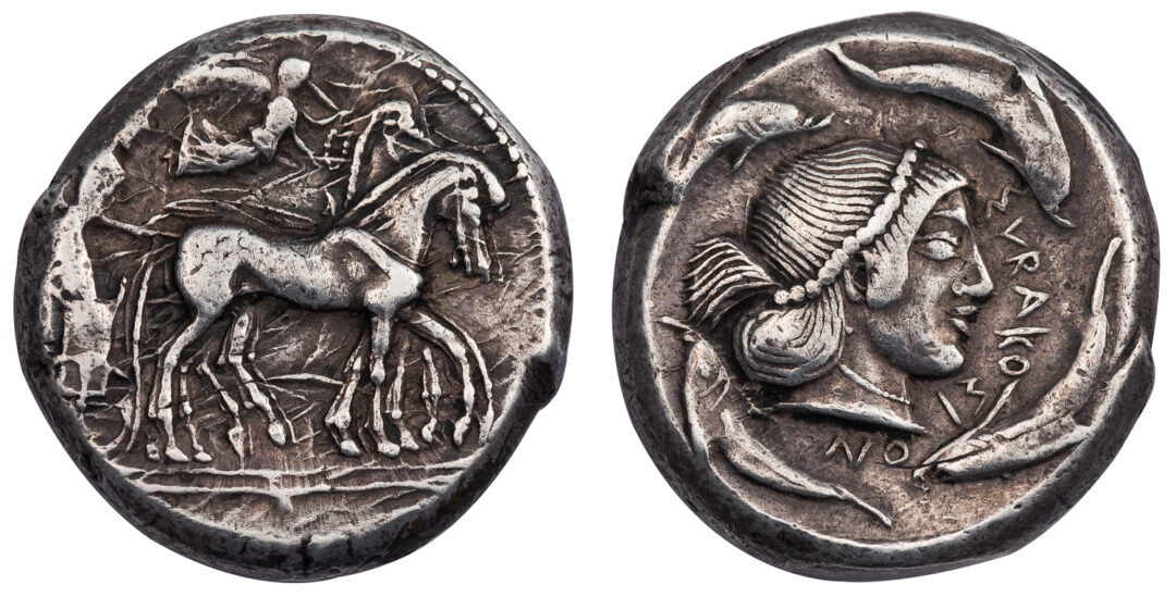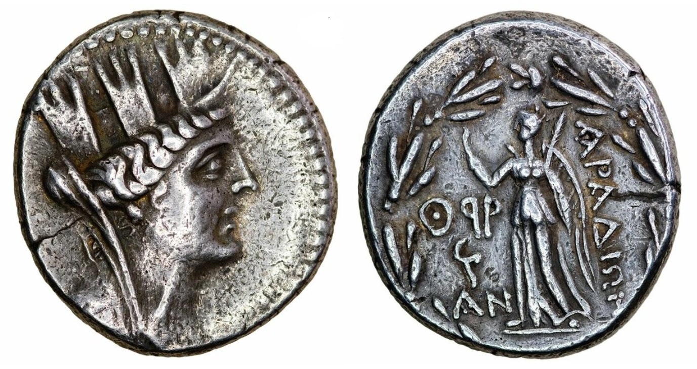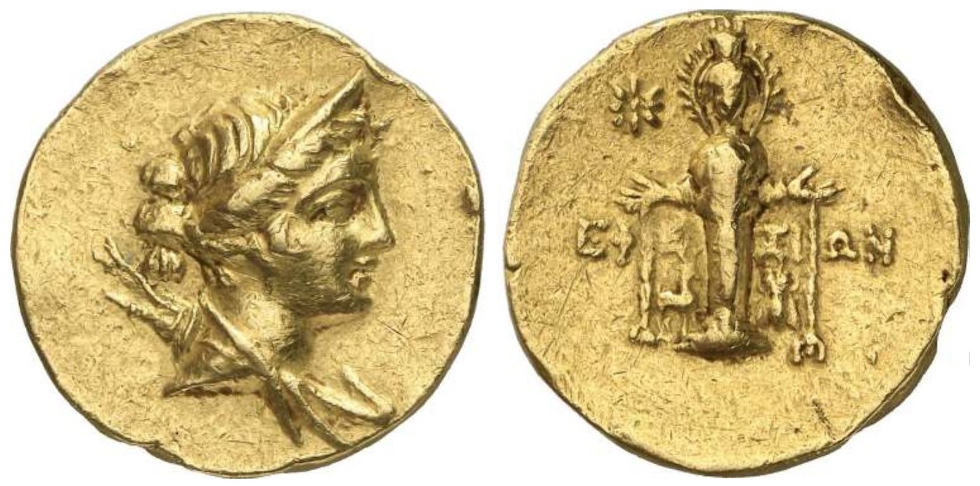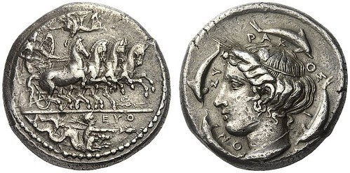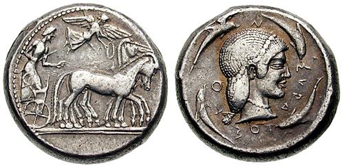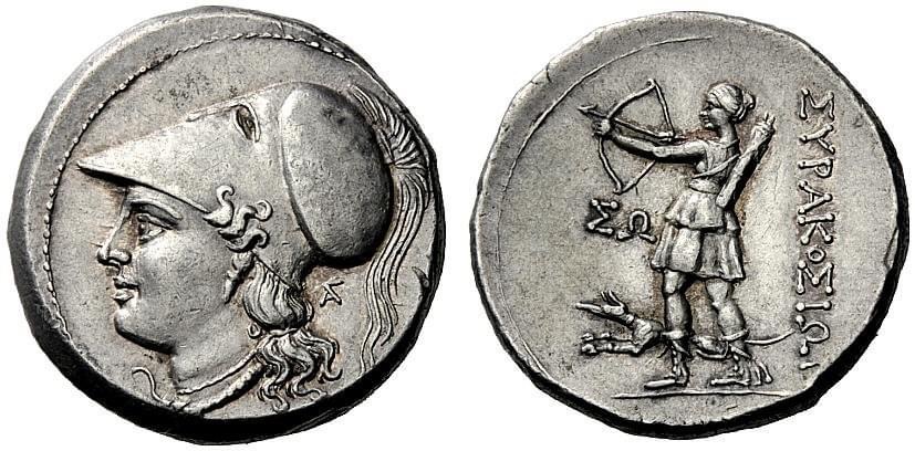 Но кога градот држава Сјракосион, бил слободен јасно забележуваме дека градот ковал кованици освен со мажи и со жена со бела физиономија со лик овој пат на божицата Ара: