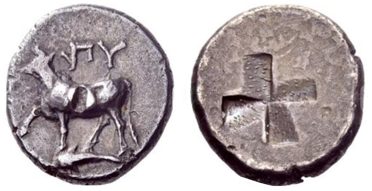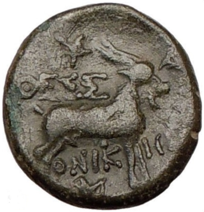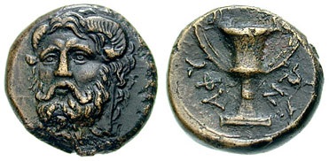 Едната страна од кованица од Ѕецалоника (Солун - Македонија) со лик на јарецот Аг.