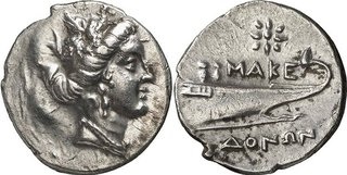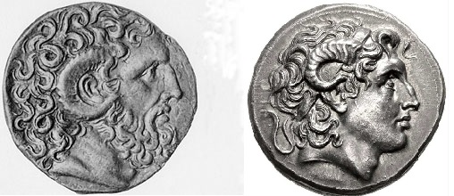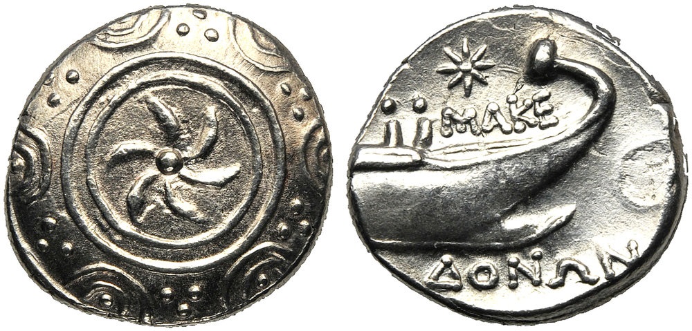 Македонска кованица од од македонскиот владетел василеос Берсеос посветена на Македонон - Македон он - Маке дон тој (десно), детето на Ма и богот Д.