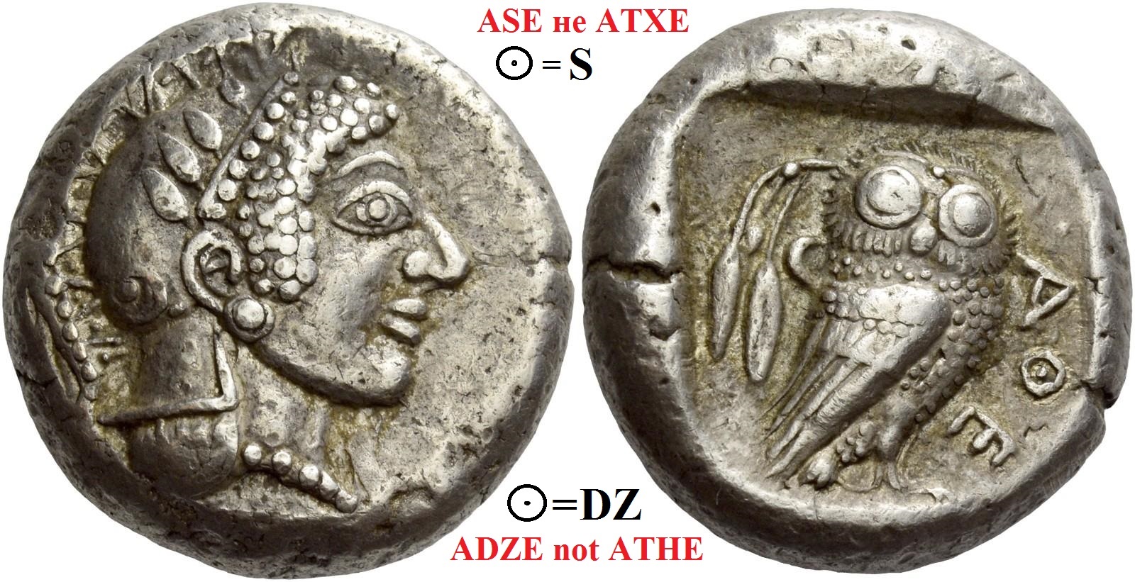 Кованици, од градот држава Ѕева (не ''теба'' зошто е погрешно прочитано) со ликот на богот Ѕе (десно): '' Ѕ '' - круг со точка - ''Ѕе''.
