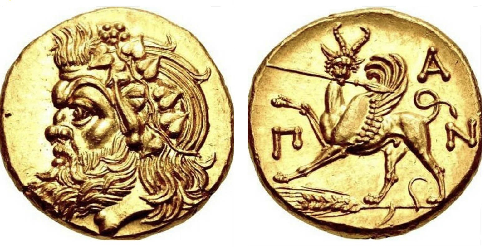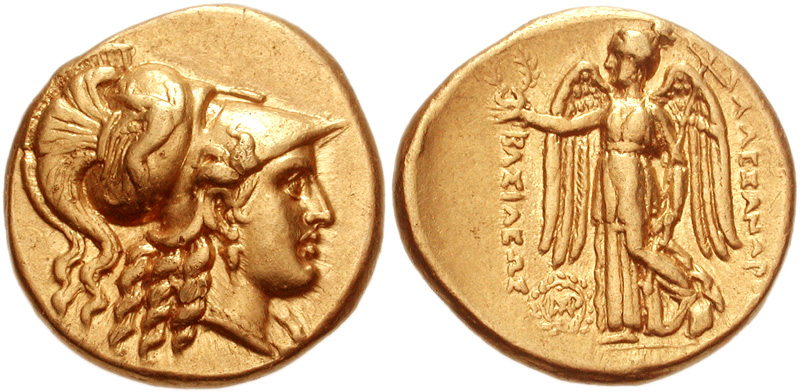 Македонскиот владетел василеон Александар Македонски во улога на богот Ѕе - богот на светлината со шлемот од Куѕе и на другата страна Ника - божицата на победата, неговите омилени древни македонски божеcтва. Василеон Македонон Александрој, кованица од злато. Kованицте со Ника и лик на Ѕе во чест на ''Легата на Ѕе'' (воениот сојуз, e основан од страна на македонскиот владетел василеос Филип Македонски) и македонските победи, биле ковани исклучиво од злато.