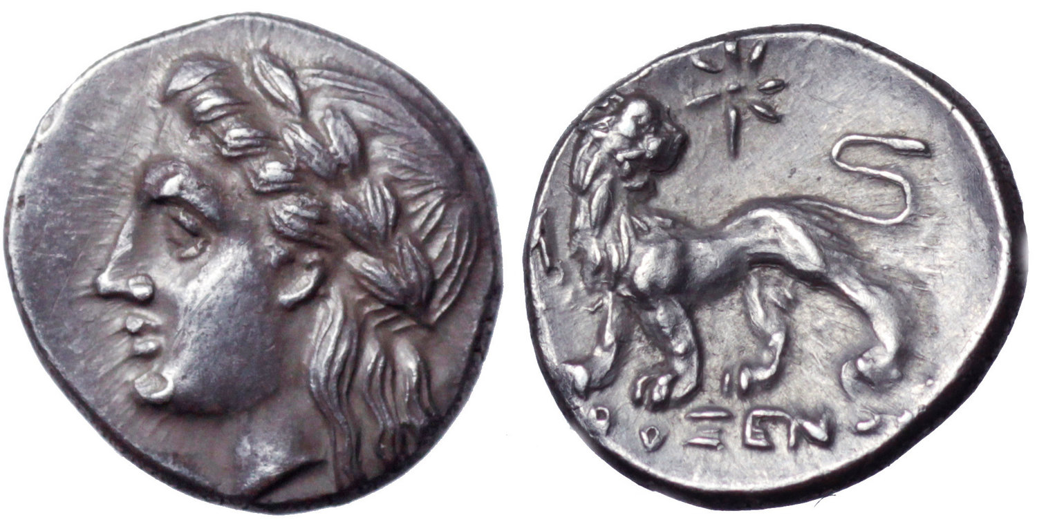 ЕФЕКСИОН (десно), кованица од градот држава Ефексион (не Хефест зошто е погрешно прочитано). Според изгледот кованицата е во чест на Ника - божица на победата, омилената божица на македеонскиот владетел василеон Александар Македонски, кованица во чест на градот.