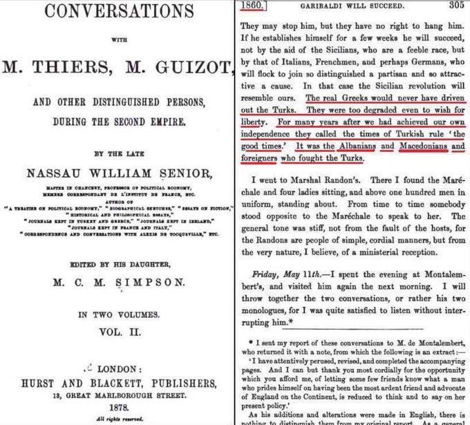 ''Вистинските грци никогаш не би ги истерале надвор турците. Тие беа толку деградирани што нé ја сакаа ниту сопствената слобода. После многу години откога ние ја освоивме нашата слобода, тие го викаа времето под турско ропство ''ДОБРИ ВРЕМИЊА'', тоа беа aлбанците и македонците и странците кои